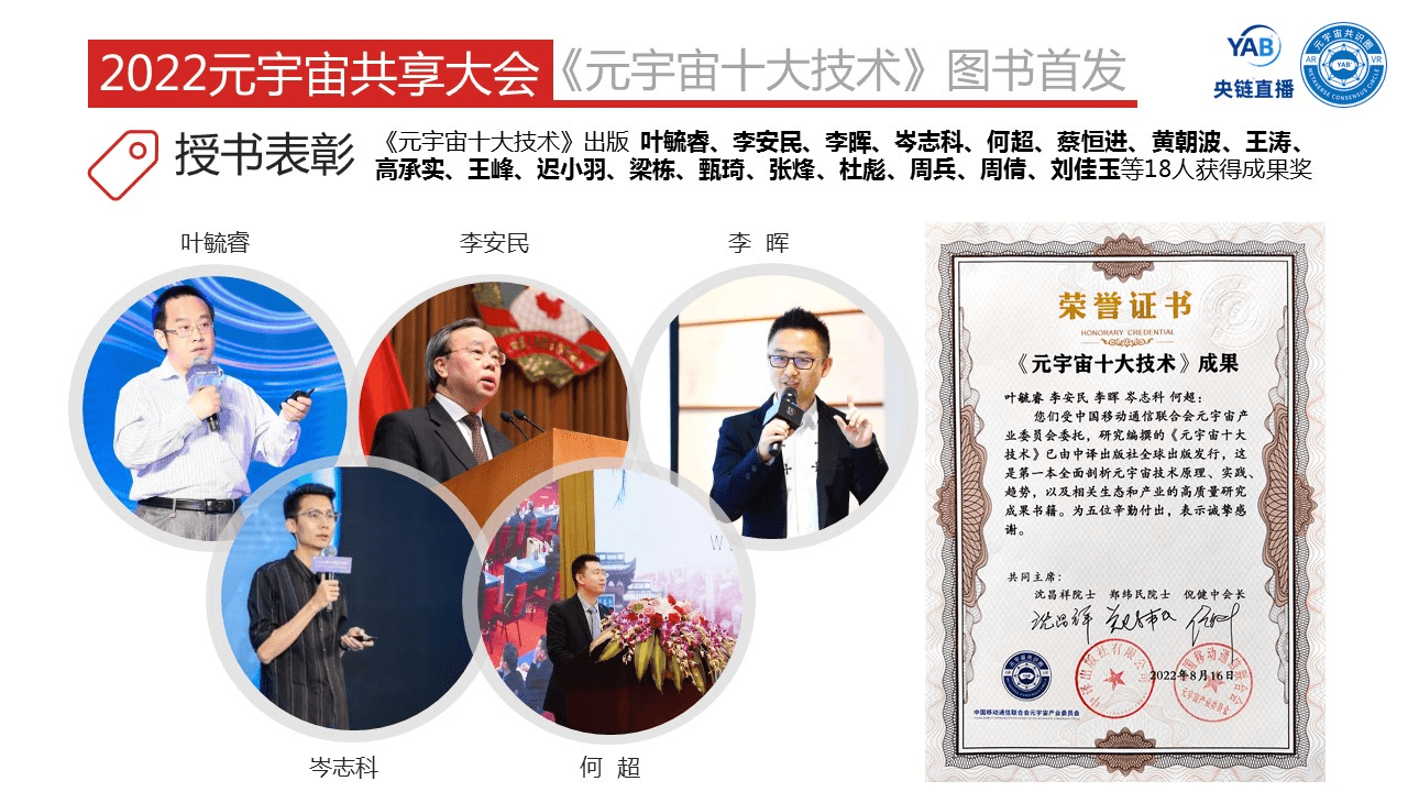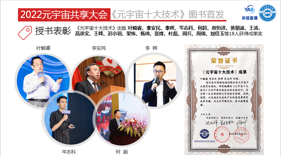 央链直播快讯:2022年8月16日,“开放与兼容”2022元宇宙共享大会暨《元宇宙十大技术》图书首发仪式,及元宇宙产业委第 一届第 二次全体委员大会,在国管局·杏林山庄(北京)成功举办。