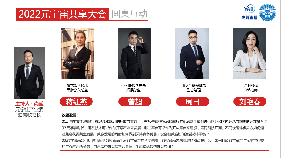 在圆桌互动环节,由元宇宙产业委联席秘书长、央链实验室执行主任尚堃主持,参与嘉宾有唯艺(杭州)数字技术有限责任公司品牌公关总监蒋红燕,中国联通沃音乐有限公司拓展总监曾超,浙文互联集团品牌部副总经理、爱创营销与传播高级副总裁周日,深圳袁宇宙科技有限公司CEO宋东来,金融领域IT架构师刘艳春。针对理念与规则、技术与应用、生态与用户共三个领域的“开放与兼容”进行了深度讨论,并形成高度认同。