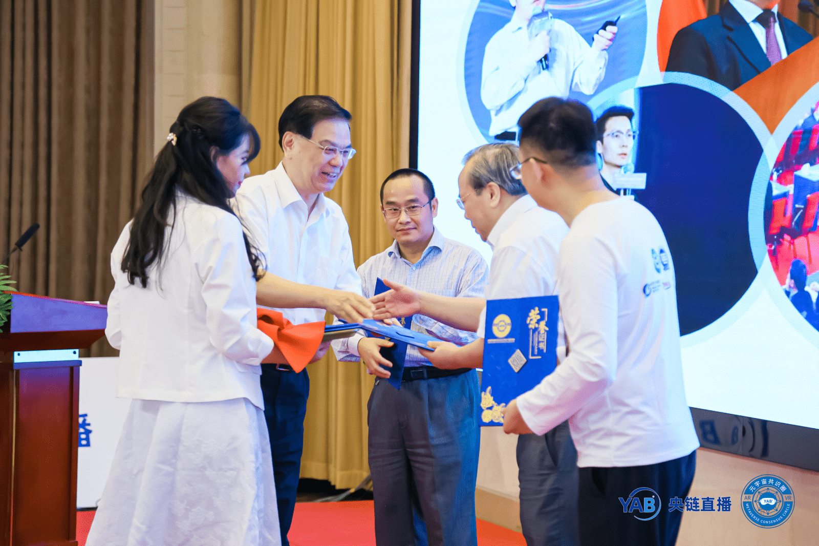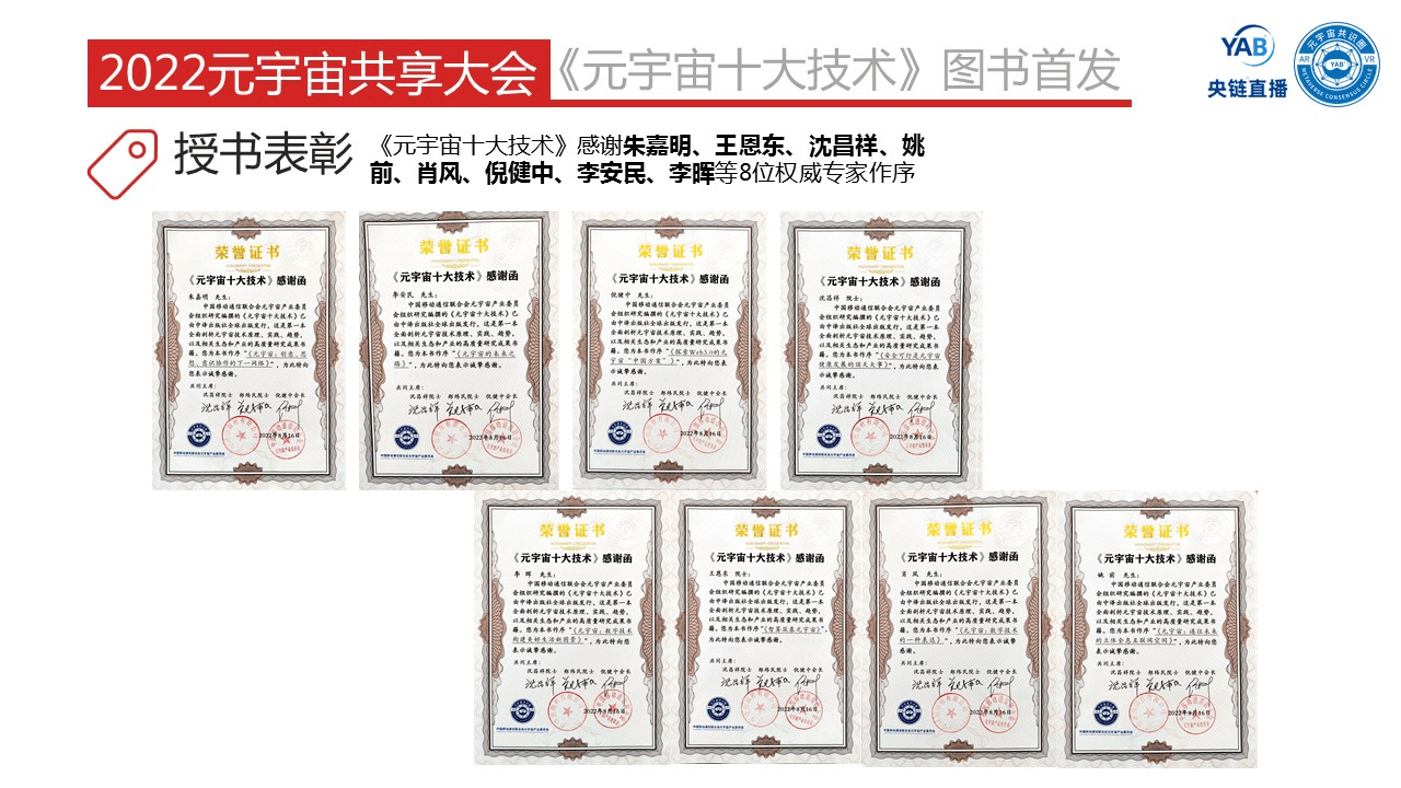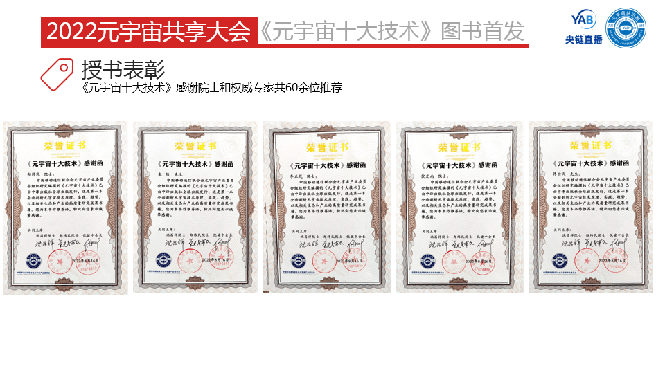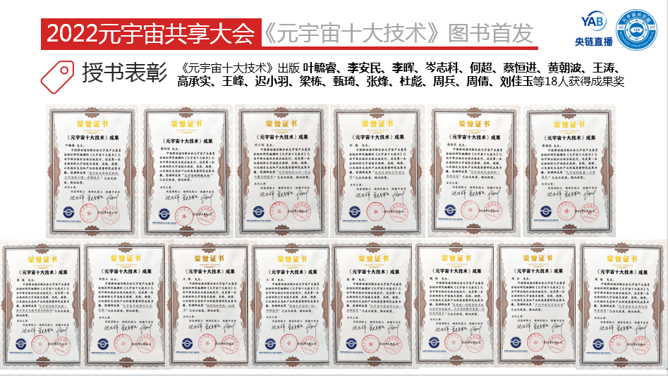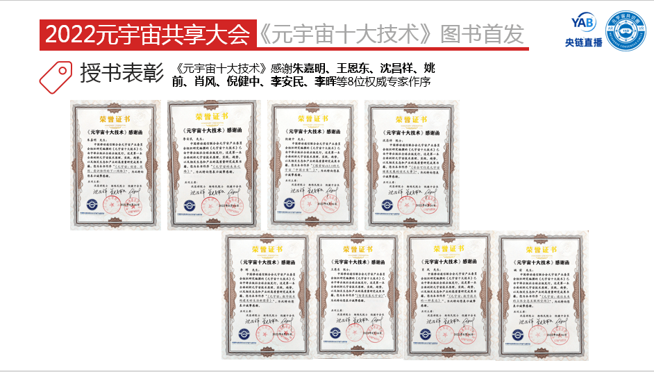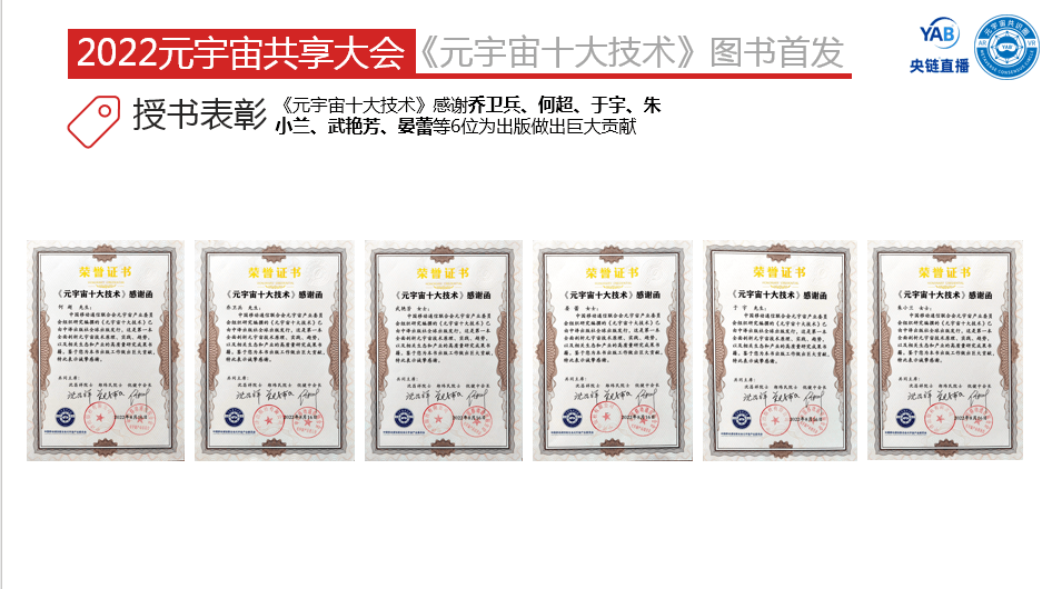 在图书首发仪式上,对授书表彰进行了一一介绍,元宇宙产业委为作者、成果人、案例单位和出版编辑颁发证书及图书纪念相框,为图书腰封定制单位授书。