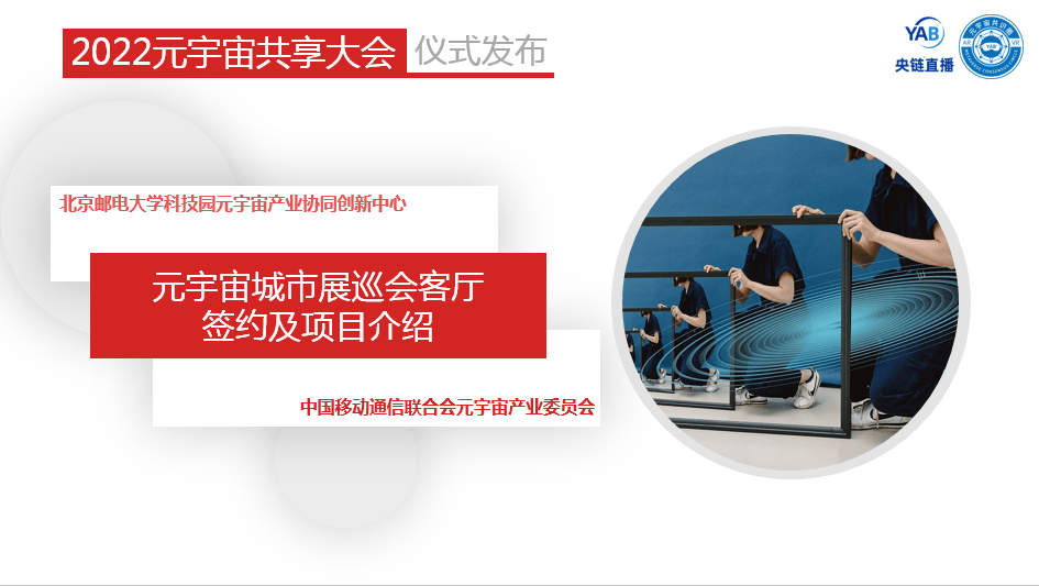 ——元宇宙产业委秘书长何超、元宇宙产业委副主任委员陈晓华启动元宇宙产业委与北邮科技园元宇宙协同创新中心签约“元宇宙城市展巡会客厅”及项目介绍。