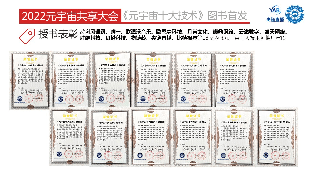感谢风语筑、*、联通沃音乐、欧恩壹科技、丹曾文化、瓣鼎网络、云途数字、盛天网络、胜维科技、贝塔科技、物链芯、央链直播、比特视界等13家为《元宇宙十大技术》推广宣传。