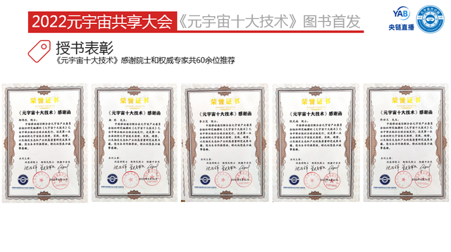 在授书表彰环节,元宇宙产业委为作者、成果人、案例单位和出版编辑颁发证书及图书纪念相框,为图书腰封定制单位授书。包括叶毓睿、李安民、李晖、岑志科、何超、蔡恒进、黄朝波、王涛、高承实、王峰、迟小羽、梁栋、甄琦、张烽、杜彪、周兵、周倩、刘佳玉等18人获得成果奖。