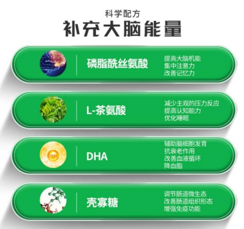 与市场上一般倾向于“补脑”的保健品不同,攸伽脑动能丝氨酸多肽固体饮品以高科技手段为依托,以固态饮料为载体,复合健康用脑为蓝本,富含DHA藻油、壳聚寡糖、磷酯酰丝氨酸、L-茶氨酸等多项营养元素,可以有效改善神经细胞功能,调节神经脉冲的传导,增进大脑记忆功能,预防老年痴呆。