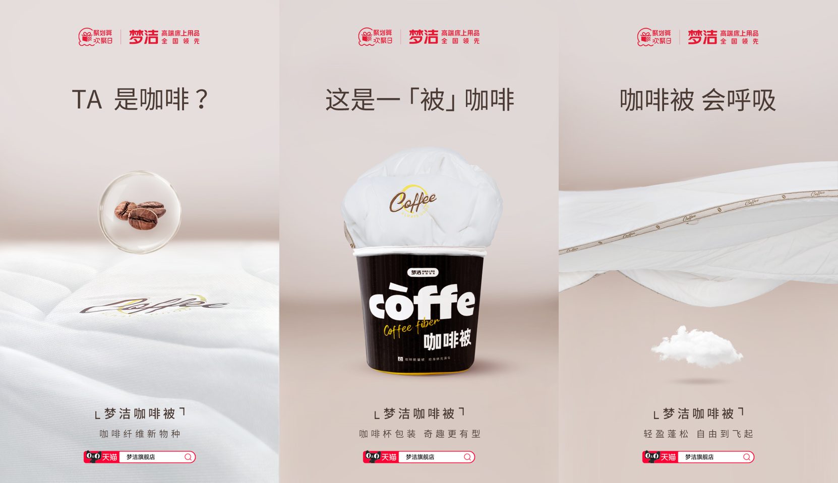梦洁掌握爆品营销的核心打法,深度洞悉年轻消费躯体,在打造备受年轻人喜欢的产品的同时,通过创意营销途径,拉进品牌——产品——消费者三者间的距离,让更多消费者深度理解产品内涵。梦洁携手天猫推出的全新概念产品「咖啡被」,开辟多维营销场景,在传递梦洁高品质的同时,玩转产品概念新花样,实现品牌声量最 大化,让梦洁的欢聚日成为了消费者的狂欢日,在年轻高净值人群当中引发热潮。