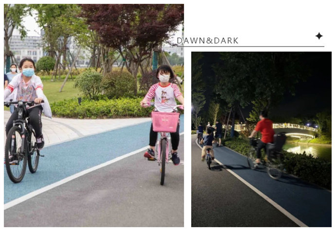 早上踏着晨曦出门,环湖晨跑锻炼,已成为业主的日常;落日时挽着爱人,一边漫步兰香湖湖畔遛娃遛狗,一边看天边晚霞成绮,湖中碎光点点,人与自然融为一体。