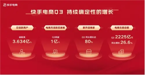 2022年的前三季度,快手平台及快手电商获得持续增长。快手最 新日活突破3.6亿,快手电商第三季度交易额达到2225亿,同比增长26.6%。快手电商第三季度月活跃买家数突破1亿人,第三季度新开店商家同比增长近80%。