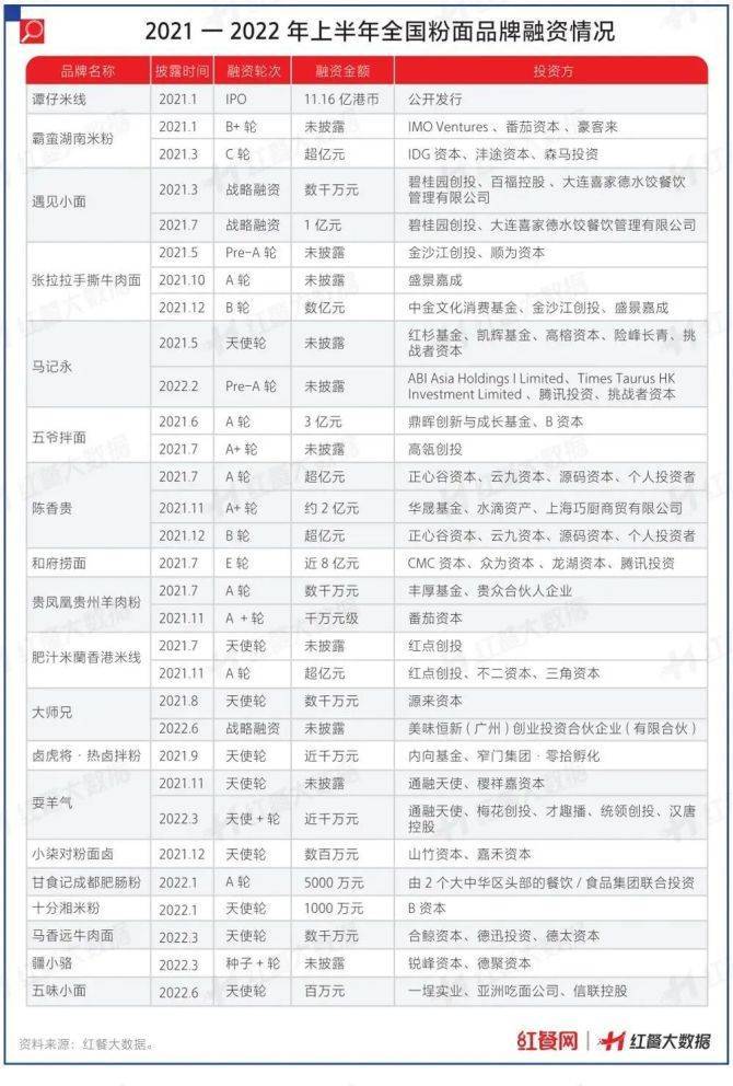 粉面类连锁品牌更成为了资本市场的香饽饽,《中国餐饮发展报告2022》数据显示,2021年到2022年上半年期间,粉面赛道备受资本的青睐,投融资事件总数超过30起。
