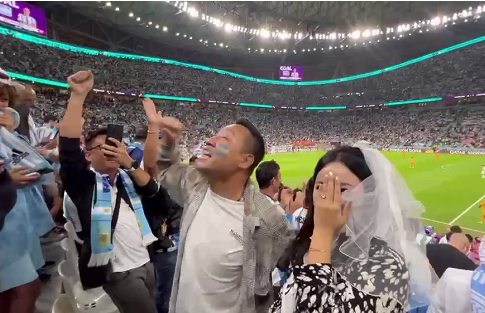 现场欢呼祝福声不断,周围的阿根廷球迷更是激动的为二人祝福,女生更是甜蜜回应“我愿意”。