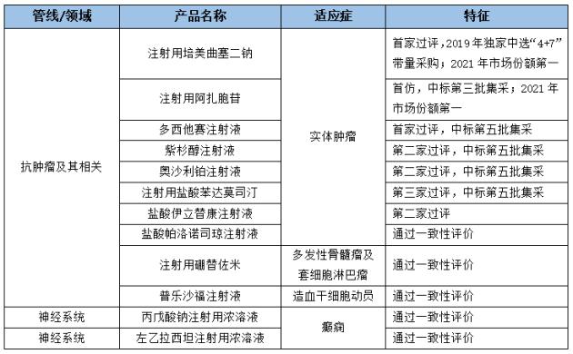 汇宇制药的普乐沙福注射液为英国首仿,今年6月在中国获得一致性评价通过,是汇宇又一款中欧共线产品,即同一生产线产品同时供欧洲出口和国内销售。普乐沙福注射液,作为适用于非霍奇金淋巴瘤患者的自体造血干细胞移植动员剂,在 2008 年于美国首次获批上市,后因疗效*而在全球 50 多个国家或地区使用。2018年我国批准进口,已成为临床治疗的重要药物,受到国内外指南与共识的一致推荐,自体移植在中国目前还未大面积开展,普乐沙福存在较大的增长空间。值得一提的是,除了普乐沙福注射液、注射用硼替佐米2个抗肿瘤领域制剂以外,公司首次新增2个神经系统管线品种上市,汇宇制药深耕高端注射剂市场,多管线品种的上市,让公司仿药制业务渐成百花齐放状态。 截至目前,汇宇制药在国内上市的肿瘤领域优质仿制化药 10 个,其他领域 2 个,全部为视同通过一致性评价产品,其中多个品种为首家或前三家过评。