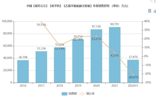 克拉屈滨注射液、乙酰半胱氨酸注射液,两个产品同样是首家进行一致性评价(新分类)申报的企业,克拉屈滨注射液,主要用于经干扰素治疗失败后活动性的伴有临床意义的贫血、中性粒细胞减少、血小板减少以及疾病相关症状的毛细胞白血病(HCL)治疗。乙酰半胱氨酸注射液,主要用于在综合治疗基础上用于肝衰竭早期治疗,以降低胆红素、提高凝血酶原活动度。根据米内网数据显示,2021年公立医院销售额分别为6490万元、90791万元。