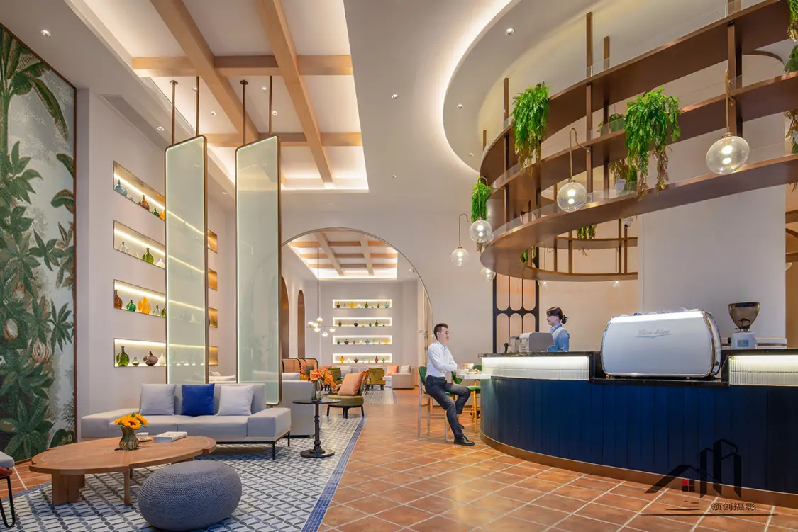 欧暇•地中海酒店结合自然与建筑平衡的设计,将拱形观景窗、圆弧门等古希腊艺术风格的柔和线条设计融合,搭配蓝、白、橄榄、金黄、原木等色彩,辅以艺术挂件、原木家居、藤编装饰、海洋岩栎墙面,自在舒适的度假氛围悄然而生。