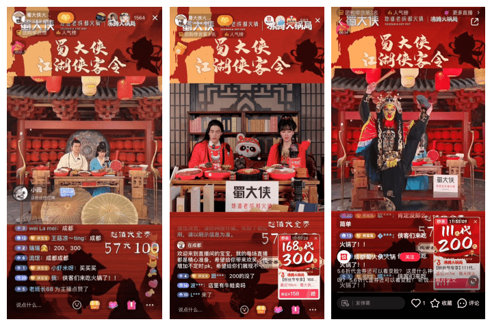 直播预热阶段,蜀大侠基于在平台深受欢迎的IP,迎合平台国风热潮,推出「侠客江湖」系列海报。“侠宝海浪”以水墨剪影登场,招式变化间尽显“功夫熊猫”本色。搭配江湖气火锅文案,这组燃值拉满、和平台年轻用户审美对味的IP海报再度破圈:还没尝过蜀大侠的用户不禁好奇,不露真面目的熊猫有什么绝活,“巴山蜀水江湖气”到底是什么滋味,激发出强烈的关注兴趣与消费意愿;而熟悉品牌的粉丝,看到这样的“送分题”,心领神会,是“侠宝海浪”出来营业了,蜀大侠必有大动作。