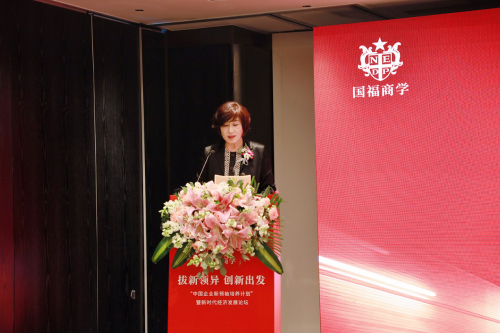 王丽峰主任在发言中回顾了国福商学的发展历程以及未来发展方向。她表示,国福的未来发展将主要聚焦四个方向:在培训方面,陆续推出新兴、热点行业的培训项目和私董联盟,强化平台与学员联动;打造国福自有高端品牌论坛以及聚焦重点领域行业峰会,满足国福企业家学员对权威信息以及创新经济的快速精准触达;大力发展平台联盟,集众人之智、聚众人之力,做大做强国福平台;发展国福生态产业,打造国福健康产业财富联盟,通过生态圈层建设让学员企业达到共生、互生、再生的目的。