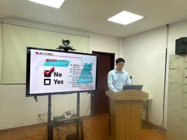 本次培训首先对诚信销售的定义以及保险行业“十不”进行集中宣导学习,稍后通过“冒用客户名义,骗取保单贷款”的一个典型案例进行解析,并对该案例中司法部门做出的判决结果及依据进行详细讲解,通过同业案例警示自身,向全员宣导“挪用、截留、侵占保险费或者保险金”等情况带来的严重后果,再一次强调销售环节是保险公司风险的关键控制点。