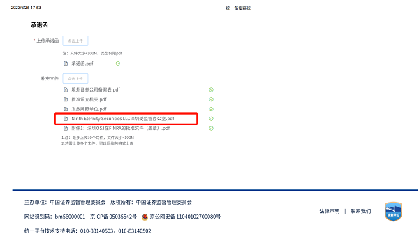 Ninth Eternity Securities(九久证券美国公司)为了同时满足两国监管部门的要求,已获得FINRA(美国金融业监管局)批准在深圳设立OSJ,有FINRA批准的Registered Principal(持牌监督负责人)董彦言女士常驻在深圳OSJ,且2023年6月底在中国证监会完成备案。Ninth Eternity Securities(九久证券美国公司)设立深圳受监管办公室的工作在2021年就启动,受监管办公室在选址、人员配置、工作流程、数据安全、监督等方面,严格按中国和美国的法律法规执行。