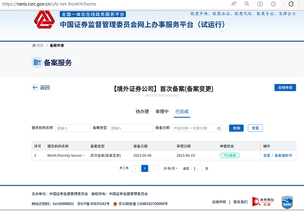 经查询FINRA(美国金融业监管局)及中国证监会的证券公司相关信息,截至6月30日在中国证监会备案的所有美国证券公司,Ninth Eternity Securities(九久证券美国公司)是*的一家在中国内地设立了受监管办公室的美国证券公司,以同时满足中国和美国的监管部门要求,为中国境内企业赴美上市满足两国监管要求的合法合规性保驾护航。