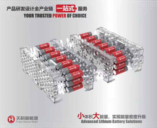 天科新能源深知,如今的新能源领域可谓是“强者如云”,想要成功获得一席之地,必须要拥有属于自身的创新科技。天科高能密度磷酸铁锂圆柱电芯,采用富锂铁酸锂(LFO)正极补锂添加剂,专为磷酸铁锂体系补锂,大幅提升能量密度,提高电池循环性能;负极采用先进的多孔铜箔集流体,一方面可降低集流体重量,另一方面可提高石墨和集流体结合力,防止循环使用导致活性物质剥离,提高循环性能;除此之外,这款产品还联合正极材料厂家和科研院所开发了正极材料大小粒径混配工艺,进一步提高电极压实密度,提高极片压实密度5%,从而进一步提高电池的能量密度。另外,天科新能源建立起了产品研发设计全产业链“一站式”服务,小体积、大能量,实现能量密度升级。