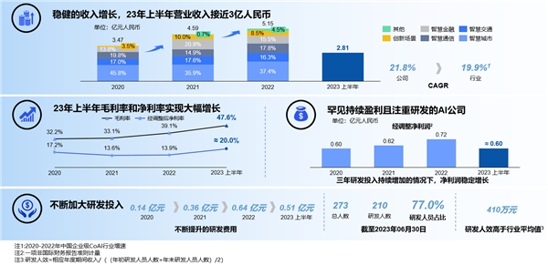 公司已经连续多年实现净利润和收入双增长。过去三年,公司营收规模从2020年的3.5亿元提升至2022年的5.15亿元,年均复合增速21.8%高于行业同期增速,2023年上半年营收接近3亿元。公司2022年经调整后的净利润为人民币7,169.3万元,同比保持稳健增长,过去三年的平均净利润约为6,400万元,2023年上半年净利润同比去年同期实现翻倍增长,上半年净利率实现大幅增长。