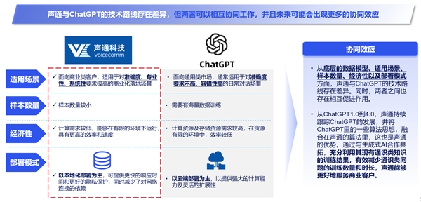 声通科技的产品主要采用的是神经网络算法和知识图谱技术,充分利用了神经网络算法对问题的总结和内容泛化的优势,通过知识图谱确保所查询答案结果的准确可靠,无需海量数据和样本也能够实现模型的高准确度的学习生成能力。如Chatgpt之类适用于通识场景的算法,优化了海量知识学习。而声通的模型更适合处理特定场景下的专业问题。在实际应用场景中,两种技术也在经历不断融合和发展的过程。