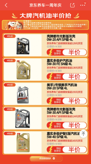 活动期间,针对首次购买汽机油的消费者,京东养车携手美孚、嘉实多、壳牌等知名品牌带来“每天1款半价机油,不限量抢购”硬核权益。其中能够大幅提升性能、有效抵御低速早燃的壳牌超凡喜力都市光影版机油,半价到手仅需124元;可激发引擎性能、带来*体验的嘉实多极护钛流体全合成机油,半价到手只要144元。此外,美孚1号银美孚先进汽机油、嘉实多极护智E版汽机油等人气爆款也在“半价抢”活动范围。