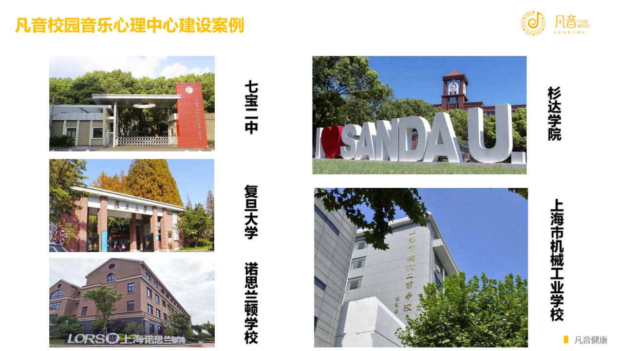 凡音优眠,在整合全球音乐治疗和表达性艺术治疗技术的基础上,结合中国传统文化和社会心理,创造性地在2019年推出青少年积极音乐心理课,经过3年多的持续实践和迭代,目前已经在复旦大学、杉达学院、七宝二中、中光中学、上海机械工业学校等院校形成了校园心理危机音乐干预综合解决方案。