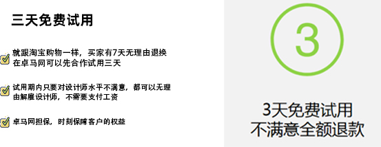 这是一个大胆的尝试!为了保证设计师的水平达到了预期以及给予雇主后悔的机会,雇主可以在设计师入职后3天内解雇此设计师并得到全额退款。但是为了保障设计师的合法权益,全额退款后,在未获得设计师同意的情况下,设计师的所有作品雇主均无权使用!雇佣是一个双向的选择,卓马网以这样的方式,让双方都有一个相对舒服的磨合期。