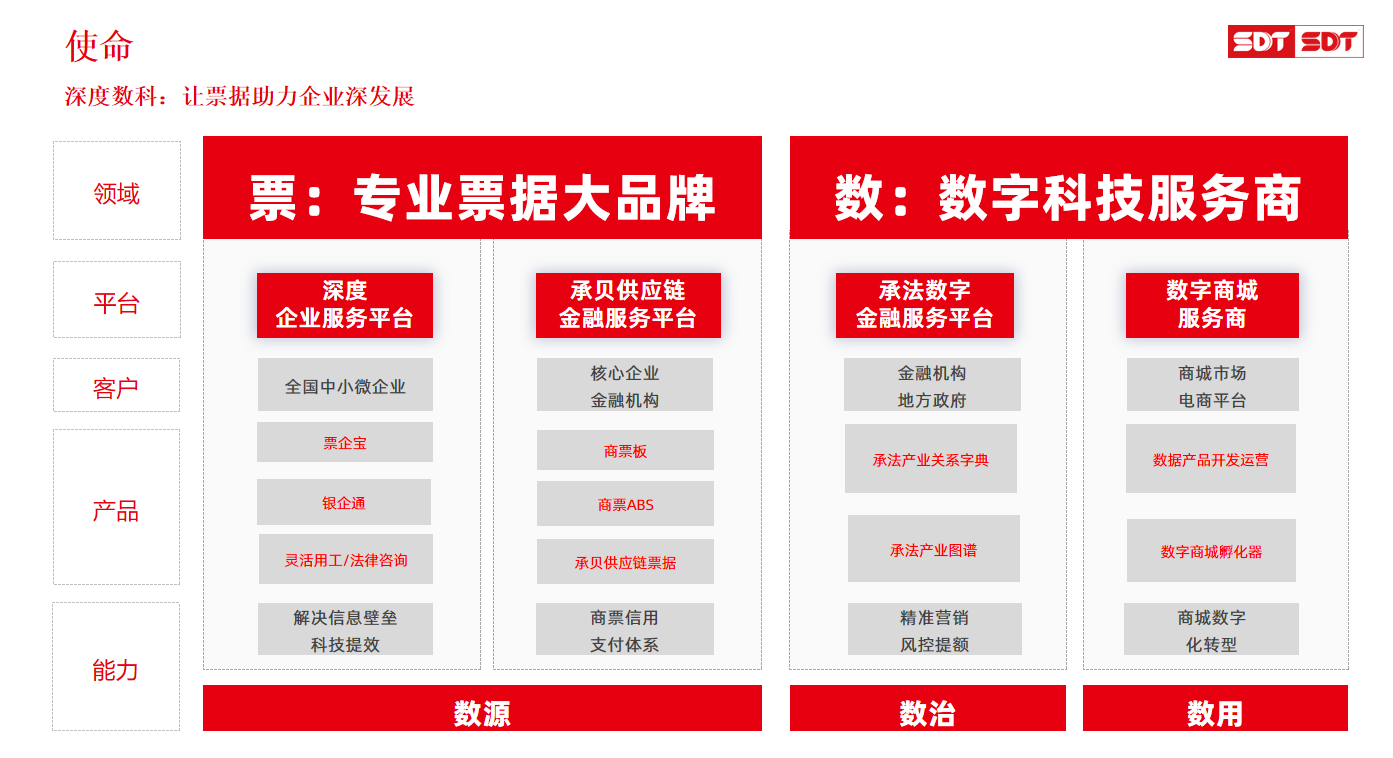 2023年中央金融工作会议上强调“坚持把金融服务实体经济作为根本宗旨”,同时指出,承兑汇票作为长期以来支持实体经济融资支付需求的基础金融产品,在提高企业间资金支付效率,降低资金占用成本及融资利率方面有着不可忽视的作用,亦在科技金融、普惠金融、数字金融方面都有着成熟的应用场景。尤其在经济腾飞的当下,中小微企业已成为国民经济增长的重要力量,而票据对于实体经济的发展将产生更加深远的影响,可以说票据是中小微企业实现高质量融资的重要道路。举例说下目前国内市场上的票据服务行业的头部企业,深度数科集团已在票据服务行业深耕多年,并始终以“服务百万级中小微企业”为愿景,通过旗下深度企服平台、商票板供应链金融服务平台等创新实践,主要解决票据市场信息不对称问题,降低企业融资成本等问题,现已累计服务全国超20万+企业,聚合40多家金融机构服务能力,普惠金融服务规模超768亿。