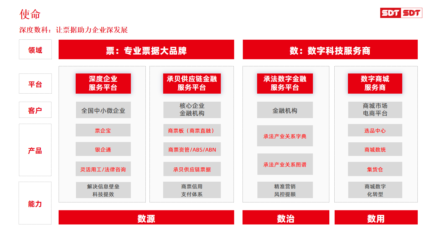 深度数科集团积极响应相关市场政策,在票据服务领域,充分发挥票据优势,助力企业实现快速发展与数字化转型,助力其提升创新能力、实现高质量发展。深度数科集团认识到科技金融是高质量发展的核心驱动力,以票据业务为切入点,通过科技赋能、产品创新、优化资金供给结构、构建数字金融新生态等方式,强化票据在先进科技行业中的作用,为更多科技创新型企业提供优质、便捷、高效的金融服务,助力我国经济实现创新驱动、高质量发展。充分发挥票据在科技创新、创业、创造中的作用。