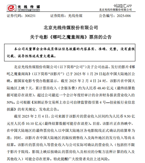 在《哪吒2》的火热背后,主控公司光线传媒赚得盆满钵满。