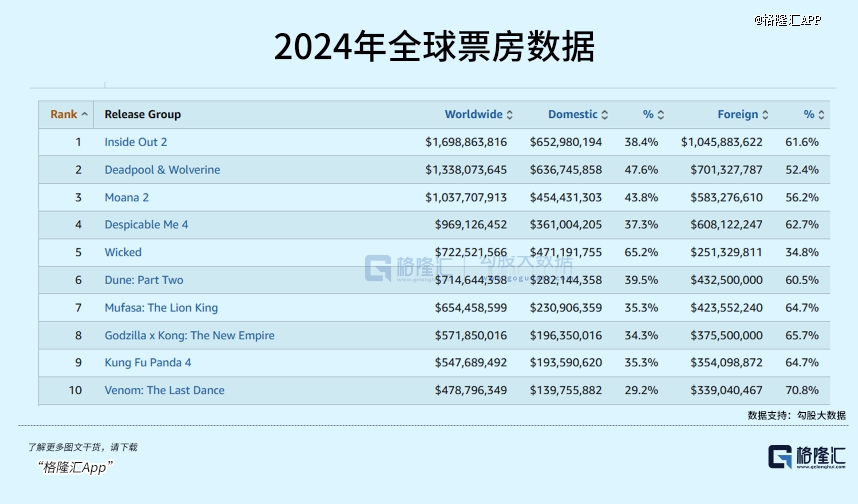 除此之外,在全球票房榜前十中,《神偷奶爸4》、《海洋奇缘2》、《功夫熊猫8》分别以9.69亿美元、8.27亿美元、5.48亿美元的票房分列票房榜第3、第4和第8位。
