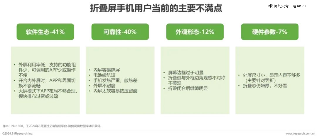艾瑞咨询2024年9月发布的报告显示,用户对于折叠屏手机的担忧主要包括软件生态、可靠性、外观形态、硬件参数四方面。其中,最 大的不满在于软件生态,可以简单理解为APP和屏幕不完全适配。