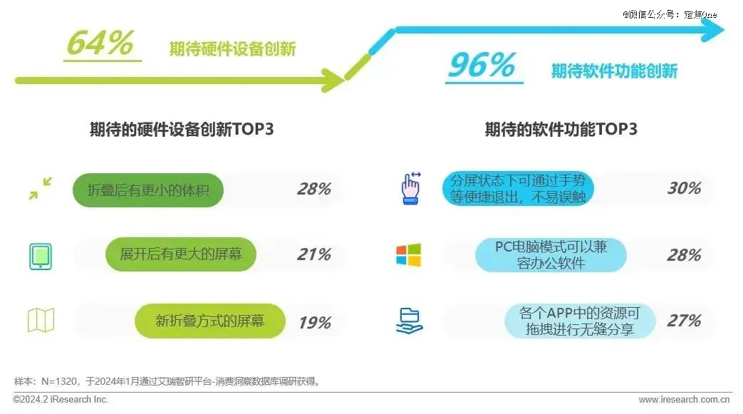 艾瑞咨询在2024年年初发布的用户调查报告显示,有96%的用户更期待软件功能的升级,希望操作更加智能化,64%的用户则期待未来硬件方面有所突破,研发体积更小、屏幕更大、具有更多折叠方式的产品。由此看来,对于绝大多数用户来说,影像、AI、续航等方面的升级,远比开拓新形态重要。
