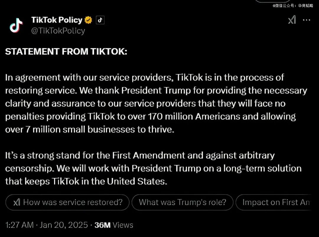 然而,就在所有人都以为一切已成定局之时,一场戏剧性的转折却在短短14小时后发生了:TikTok在社交媒体上发布声明,公司已与互联网服务提供商达成一致,正在恢复相关服务。