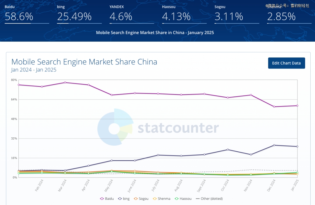 StatCounter数据显示,2025年1月,在中国搜索市场,百度的市占率为47.07%,在移动搜索市场,百度的市占率更是高达58.6%。很大程度上说明,现有的解决方案很难将百度拉下马。
