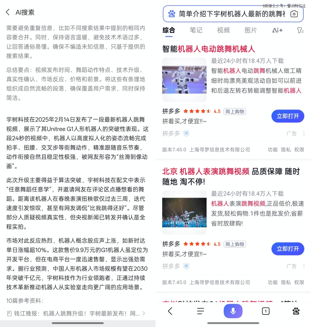 比如,我们把“简单介绍下宇树机器人最新跳舞视频”的问题同时抛给微信AI搜索和百度,前者对事实及背后的技术原理给出了详细的介绍,可以带来更出色的使用体验。