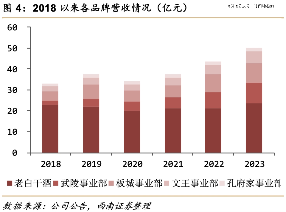 来自老白干酒财报的数据显示,2018年至2023年,孔府家系列酒分别实现营收0.98亿元、1.62亿元、1.48亿元、1.77亿元、1.46亿元、1.79亿元;2023年,孔府家系列酒营收占比仅约3.6%。