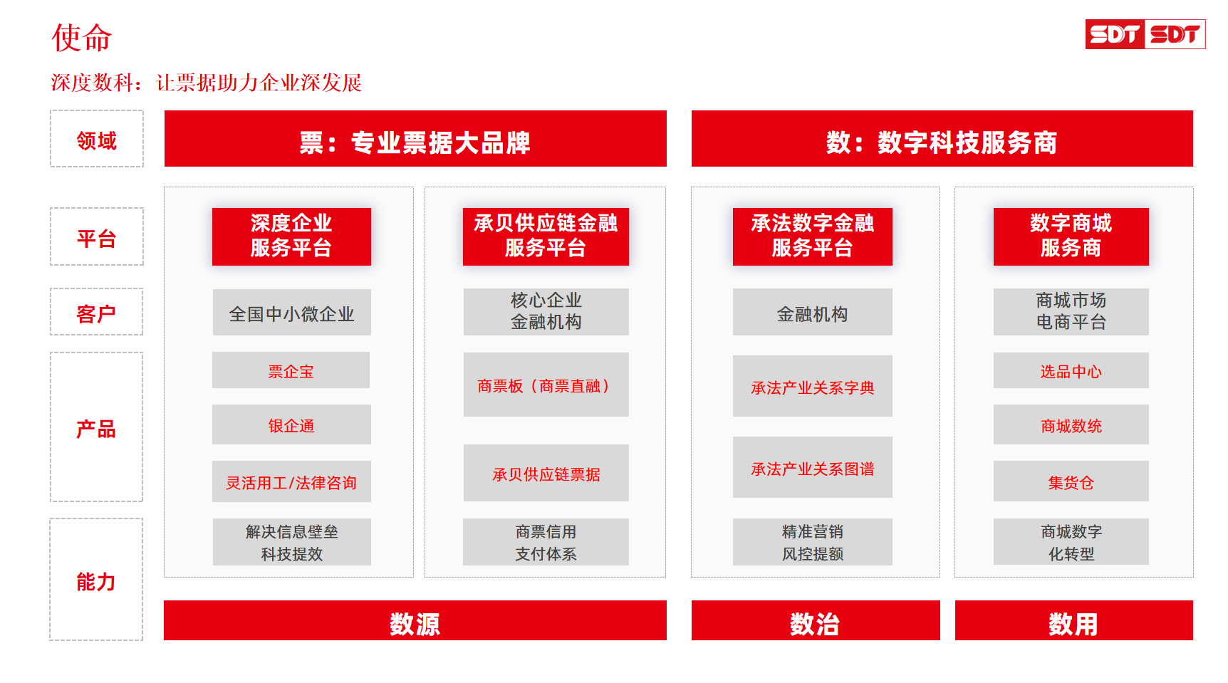深度数科集团始终坚持扎根产业、服务产业的发展理念,面向国内优质的产业集群以及细分行业客户群体,围绕核心企业产业链,以票据为核为企业、金融机构、地方政府等各类客户提供全价值链的科技产品与解决方案,服务供应链场景票据全生命周期,近年来更是在探寻、推广上海票交所创新产品--供应链票据的过程中,精准发力,走出了属于自己的“深度模式”,在服务实体经济、助力中小微企业转型升级、推动产业链整体优化等方面成效显著。