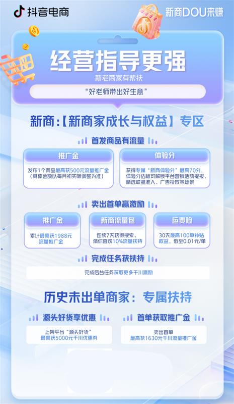 2025年初,抖音电商推出九大商家扶持政策,其中之一是全年将投入数亿元成立“小商家帮扶基金”,为小商家的商品发布、首单激励、长线运营等多场景提供支持。近期该项政策正加速落地并持续更新,为小商家的经营发展提供助力。