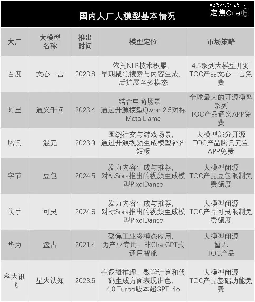 最后看市场策略,在一定程度上反映的是,大厂对自身能力和行业趋势的判断,外界可大致观察到的内容分为两块,开闭源与TO C产品是否免费。