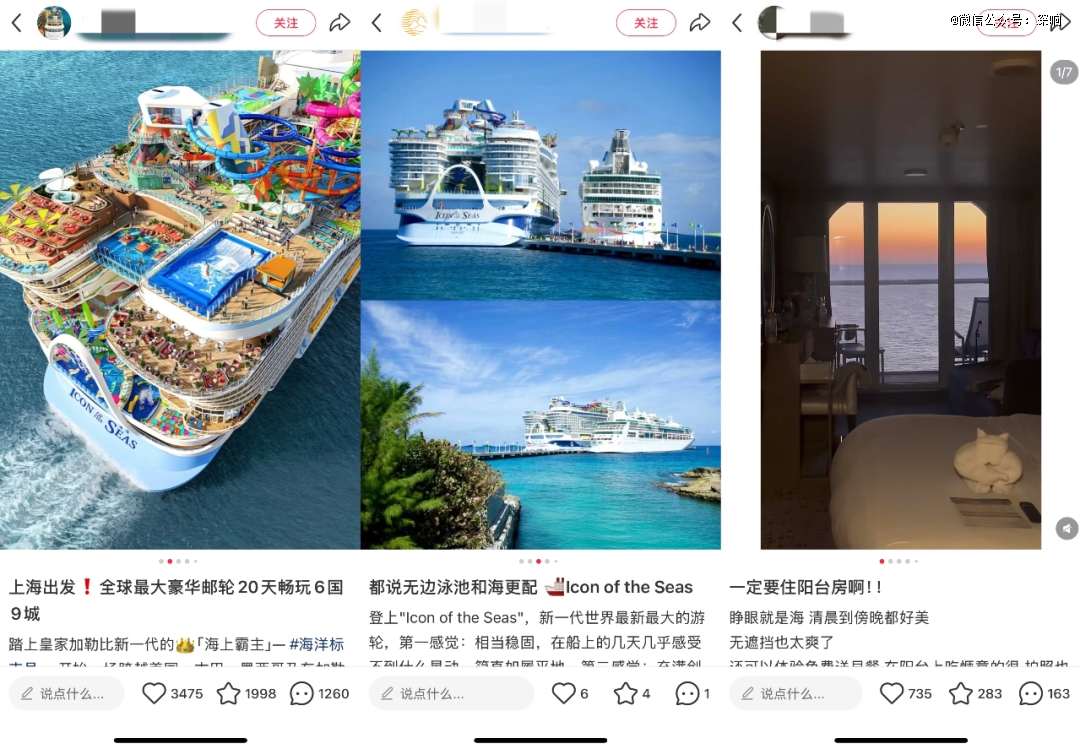 除了OTA平台,邮轮也跨平台出现在了多个直播间、博主的vlog以及信息流广告里。比如去年618和双11李佳琦的直播间都有*加勒比邮轮的产品上架,近期38生活节也有爱达邮轮;B站上400万粉大UP“HOLA小测佬”的一条推广视频获得了千万播放。现在打开小红书,你能看到不少KOL、KOC的视频下方有直接跳转预定的链接;微信里还会在朋友圈里刷到邮轮的广告。