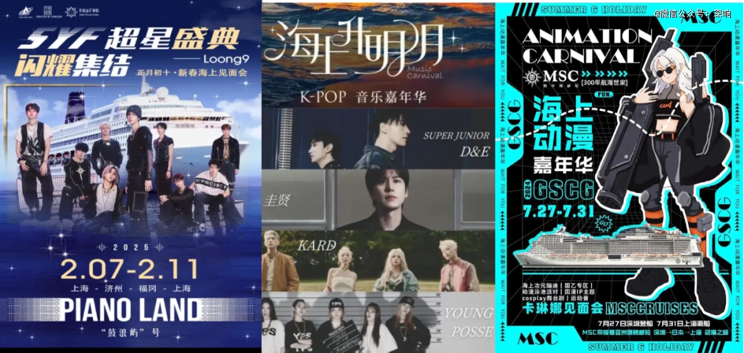 今年年初,乐华旗下男团Loong9在 “鼓浪屿号”邮轮上举行新春海上见面会,和天津“梦想号”举办的K-POP音乐嘉年华,将邮轮旅行变成演唱会、见面会,引得不少粉丝抢购。