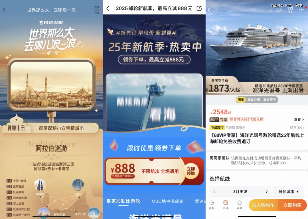参与OTA平台的活动是必选项。比如携程邮轮会通过自有官方频道、官方直播间、携程老友会、线上线下联合投放等诸多资源组合给到合作船司。同程旅行在今年一开年也上线了“2025新航季”活动,*加勒比、MSC地中海以及爱达邮轮三大船司都参与其中,今年春夏的具体航线都详细列出。近日飞猪的“全球旅行节”中也有很多邮轮产品参与,如*加勒比邮轮还会推出88VIP专享价的航线产品。