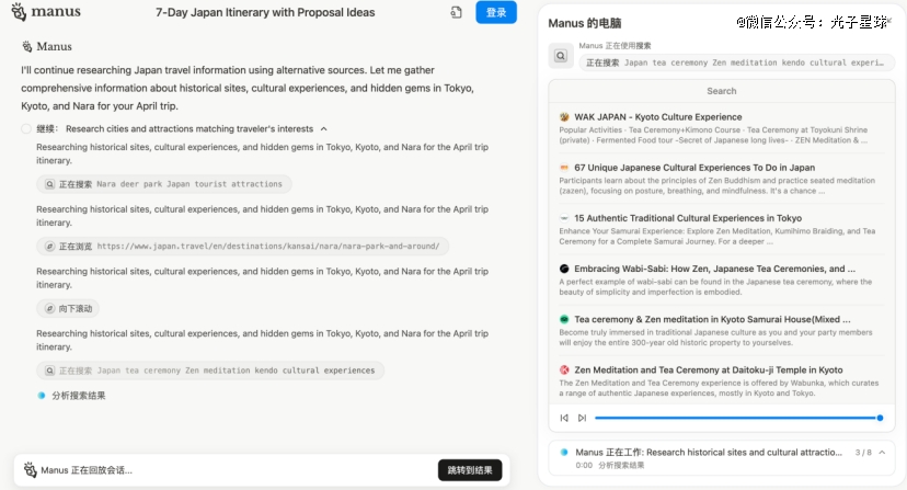 打开Manus界面,有四部分构成,分别是浏览器、搜索、编辑器和终端。Manus自称“套壳”名副其实,跟AI搜索Perplexity一样,是把各类功能组合封装好的一款产品。