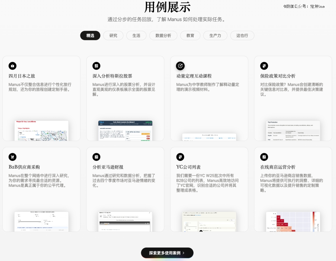 Manus的定位是通用型AI Agent,在执行同量任务情况时,试图让用户花的时间越短越好,所以它做了一个大整合,希望用越快的操作方式、越少的操作步骤为用户提效。