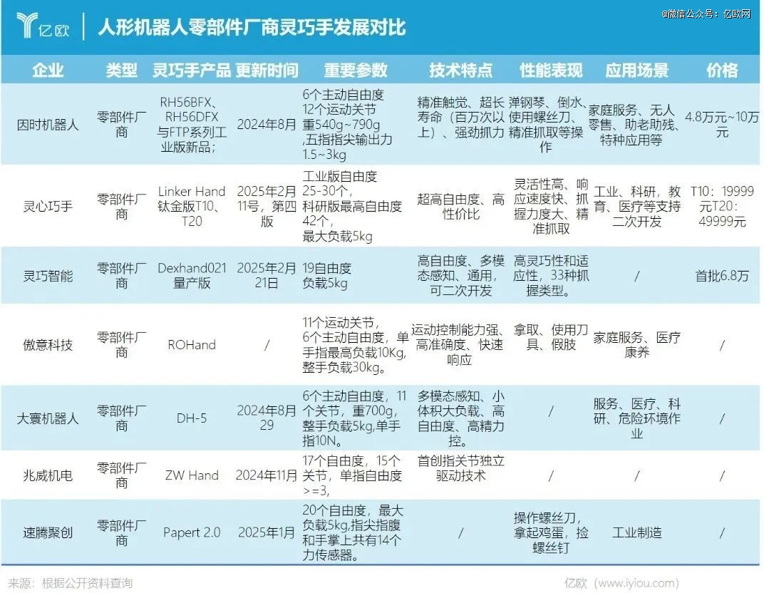 亿欧统计了目前国内主流的灵巧手产品,主要包括人形机器人本体厂商及上游零部件厂商灵巧手产品。
