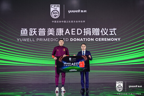 发布会现场,鱼跃医疗向中国足协中国之队代表捐赠了鱼跃普美康自动体外除颤仪(AED)设备,后续还将为青少年们提供公益急救培训与健康知识普及,为中国之队赛事及训练筑起"生命安全防线",进一步提升赛事安全保障水平。