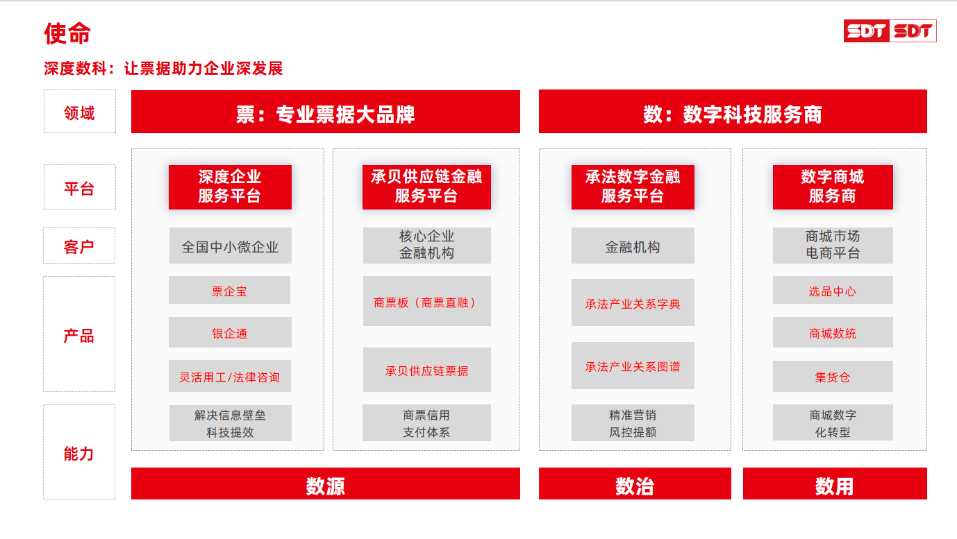 深度数科集团深知,政策是市场发展的风向标。因此,集团始终紧跟政策与行业步伐,为实现服务百万级中小微企业的愿景不断努力。从最初的深度企业服务平台到商票板再到承法产业图谱。深度数科集团紧抓企业在票据使用上的难点、痛点,致力于践行“让票据助力企业深发展”的使命。深度企服平台的票据信息墙、银票秒贴等等产品,满足了用票企业的日常需求,除了传统的票据融资业务外,深度数科还拓展了多种应用场景。例如,在供应链金融领域,通过与核心企业的合作,为上下游企业提供全面的金融科技服务解决方案。此外,公司还涉足信息评估、风险管理等多个领域,形成了完整的票据科技生态系统。