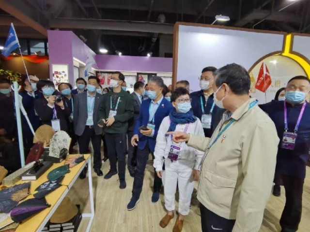 汤晓红(右二)在展销会上介绍苏扇
