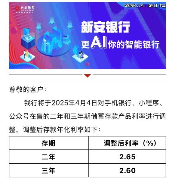 新安银行调整利率的通知。调整后,3年期定期存款利率低于2年期定期存款利率,形成了利率倒挂的现象。