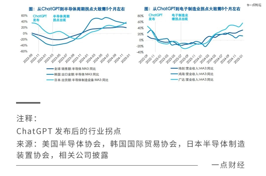 参考海外经验,技术突破到业绩兑现通常滞后1-2个季度。比如,ChatGPT发布到半导体周期拐点大致经历5个月左右,到电子制造业业绩趋势拐点大致需8个月时间。